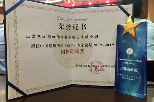 6月29日,2019年第六屆中國建筑防水(南方)專家論壇在湖北工業大學召開。本次論壇由中國建筑防水協會、深圳市防水行業協會、湖北工業大學等聯合主辦,東方雨虹作為協辦單位受邀出席,并獲得由組委會頒發的“中國建筑防水(南方)專家論壇2009-2019團體貢獻獎”。同時,東方雨虹董事長李衛國先生榮獲湖北工業大學防水材料與工程學科建設與咨詢委員會頒發的“防水材料與工程”學科專業貢獻獎。