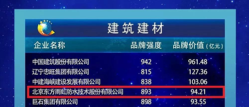5月9日,由新華社、經濟日報社、中國國際貿易促進委員會、中國品牌建設促進會、中國資產評估協會等單位聯合舉辦的“2019中國品牌價值評價信息發布”活動在上海舉行。東方雨虹憑借品牌強度893分,品牌價值94.21億元的成績上榜2019中國品牌價值評價信息榜。