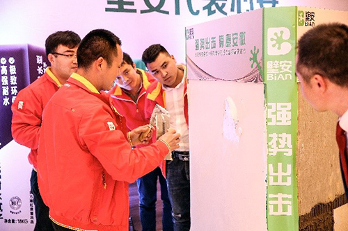 民建公司高級產品經理潘佳對壁安全品類產品做詳細介紹。大會共發布壁安產品21種,涵蓋瓷磚膠、膩子粉、界面劑、堵漏寶、填縫劑、防水等品類。為更好地展示產品性能,合肥當地知名瓦工杜師傅和意向客戶現場對部分產品進行試刷,并邀請與會嘉賓上臺感受產品的施工體驗。