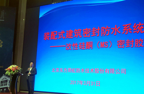 會(huì)上,朱衛(wèi)如作“裝配式建筑密封膠防水系統(tǒng)解決方案”主題報(bào)告,從裝配式建筑密封防水系統(tǒng)的開發(fā)背景和產(chǎn)品研制來源入手,針對裝配式建筑防水提供系統(tǒng)解決方案;詳細(xì)介紹了東方雨虹改性硅酮密封膠系列產(chǎn)品的產(chǎn)品性能、優(yōu)勢和施工工藝,其中包括建筑石材專用改性硅酮密封膠、PC建筑專用改性硅酮密封膠、門窗專用改性硅酮密封膠和防霉專用改性硅酮密封膠,這四款產(chǎn)品貼合裝配式建筑的特點(diǎn),系統(tǒng)滿足了裝配式建筑密封防水的功能需求,尤其適用于裝配式建筑工程。