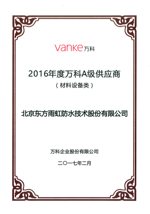 大道當然、攜手共贏!自2013年起,萬科每年都會對供應商進行評估分級,向社會發布合格供應商名錄,使之成為萬科供應商管理的重要依據。2016年,萬科對評估方法再次升級,將第三方質量評估成績、天網行動材料檢測合格率、客服返修率以及分公司合作反饋等多個維度相結合,建立可量化、可考核、可追溯的全維度評估體系,對總包、裝修總包、景觀綠化、門窗幕墻、材料設備五大類供應商進行了評估分級。在此背景下,東方雨虹仍連續4年榮獲“A級供應商”,是雙方在精誠合作的基礎上,來自萬科對東方雨虹防水系統服務品質的肯定。 從2006年與萬科集團簽訂北京區域合作協議,到2008年與蘇南萬科戰略協議,再到2009年與萬科簽署集團戰略采購協議,10余年來,東方雨虹以品質與服務贏得萬科的信任,同時也憑借此與包括萬科在內的100余家大型房地產商、企業集團建立長期穩定的戰略合作關系。接下來,秉承著“為人類為社會創造持久安全的環境”,以“防水系統服務商”為定位,東方雨虹將一如既往以卓越品質與優質服務為基礎,不遺余力地成就“好房子不漏水”。