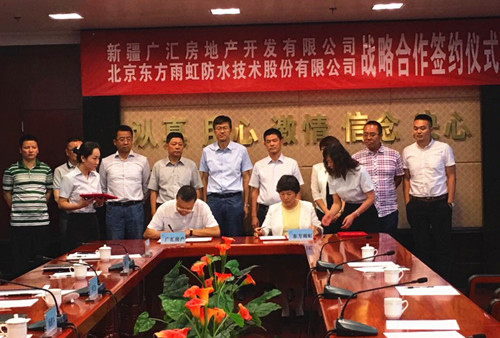 8月3日,新疆廣匯房地產開發有限公司與東方雨虹在廣匯集團總部簽訂戰略合作協議。廣匯實業集團董事、房產置業總經理楊鐵軍,實業集團董事局秘書李文強,房產置業集團總工程師王斌,開發公司副總經理熊煒,招采中心主任賈建軍,人力資源行政部部長申強;東方雨虹防水集團副總裁張志萍,工程渠道事業部西北區總經理楊海明,工程渠道事業部新疆區域總經理路曉征,工程渠道事業部新疆區域經理李曉璐等出席簽約儀式。