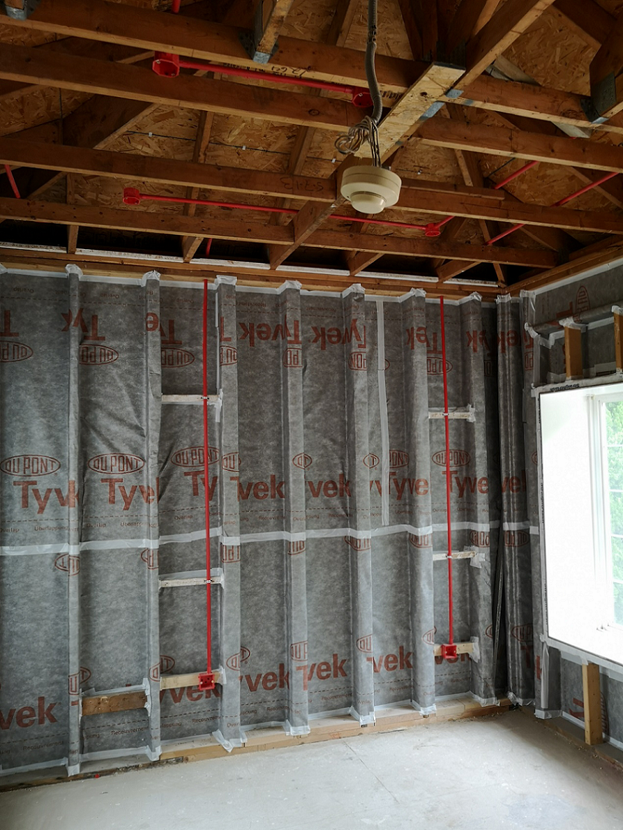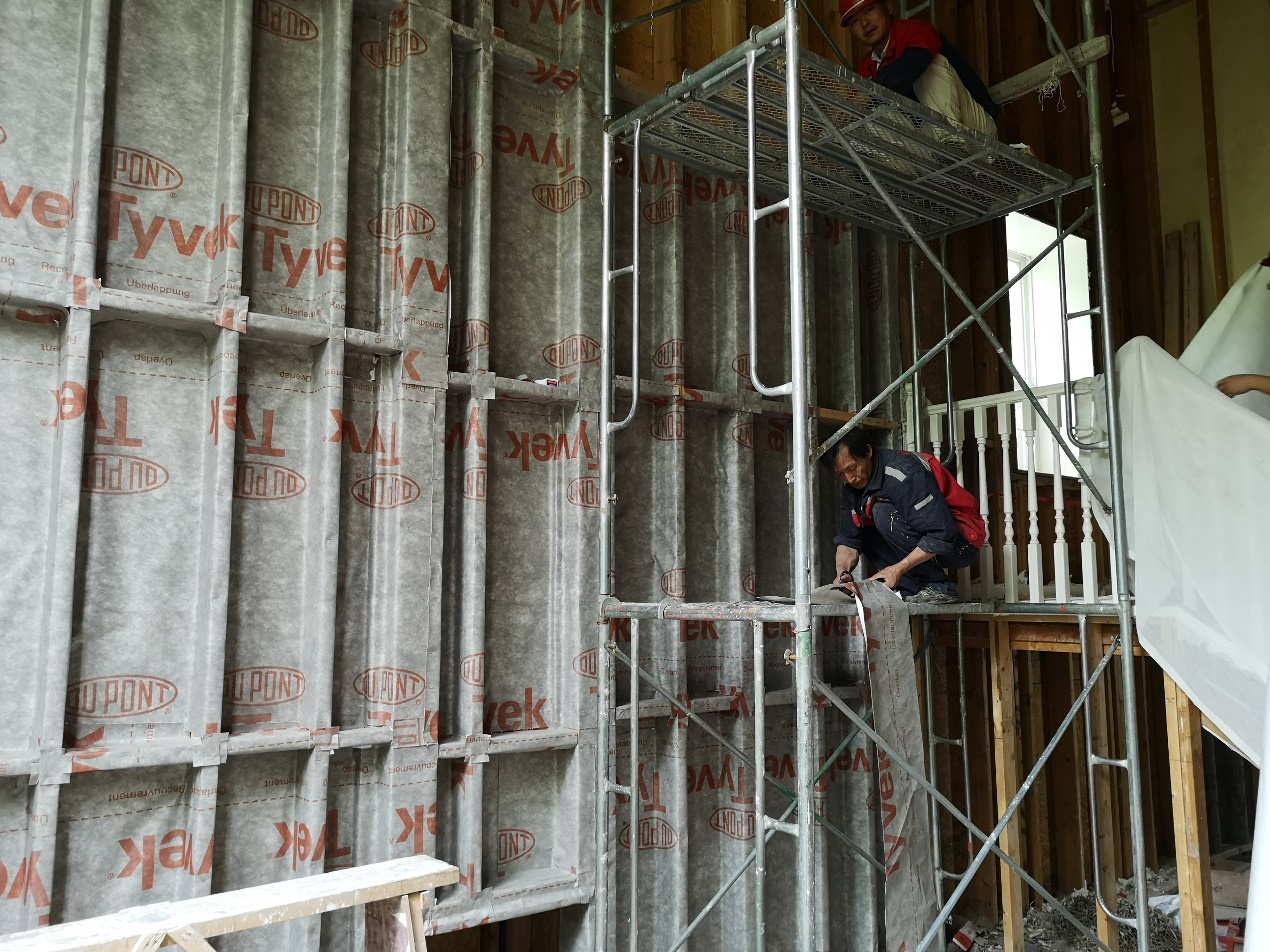 特衛(wèi)強(qiáng)®防水透汽膜可防止外部雨、雪、昆蟲等對建筑的侵蝕,杜絕了濕氣的來源,另外其獨特的透水蒸氣性能,又能讓建筑墻體中的濕氣排出,避免潮氣在建筑墻體中的滯留。防水透汽膜一般用于建筑墻體靠外一側(cè),本項目翻新時先做防水透汽膜的施工,施工工藝為空鋪,由墻角從下往上施工,采用木工釘或氣釘間隔300~600mm加以固定,并配合配套膠帶對拼接縫進(jìn)行密封,干作業(yè)施工便捷,縮短維修工期。在建筑翻新過程中無需拆除建筑外墻裝飾,室內(nèi)作業(yè)不受環(huán)境影響,施工干擾性小。