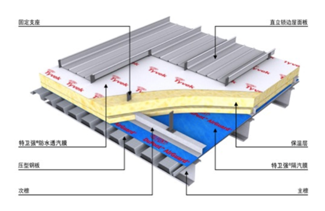 特衛強®防水透汽膜/隔汽膜適用于機場、火車站、公共場館、商業中心、辦公樓、工業廠房、冷庫、住宅等領域的屋面和墻面。包括金屬屋面系統、干掛面板幕墻系統、木結構/輕鋼結構住宅墻面屋面、瓦屋面、冷庫及低能能建筑等領域。