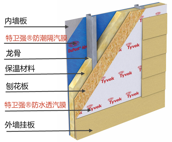 防水透汽膜在輕鋼結構或木結構的應用是其最早的應用方式,一方面其防風性能給建筑提供了一道很好的氣密屏障,降低了空氣滲透導致的對流散熱,讓建筑更節能;另一方面其透汽性能幫助圍護結構內的水蒸氣擴散,避免建筑受冷凝的損害,保持結構的自然干燥,提高輕鋼或木結構主體的使用壽命。