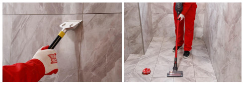 用吸塵器或毛刷清理粉塵:使用粉塵吸塵器將瓷磚縫隙內部的粉塵吸干凈,瓷磚縫隙兩側2cm寬采用抹布擦洗干凈,保證瓷磚縫隙內不潮濕,無粉塵、顆粒、油漬、疏松物等,同時清潔瓷磚表面污染物。如擔心使用吸塵器清潔仍不夠徹底,可繼續采用毛刷清理吸塵器處理不到或難以處理的位置,保證所有的瓷磚縫隙干燥無粉塵。