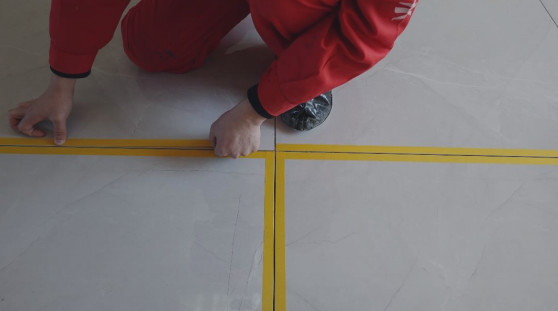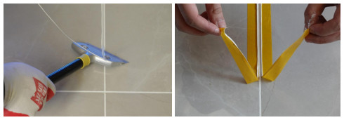 壓縫處理(粘貼美紋紙):若需靚縫劑固化后瓷磚縫隙充分飽滿成水平面,可采用美縫刮板或軟膠板沿瓷磚縫隙均勻的用力從一端拉向另一端,且不偏離美紋紙,以防污染瓷磚表面。