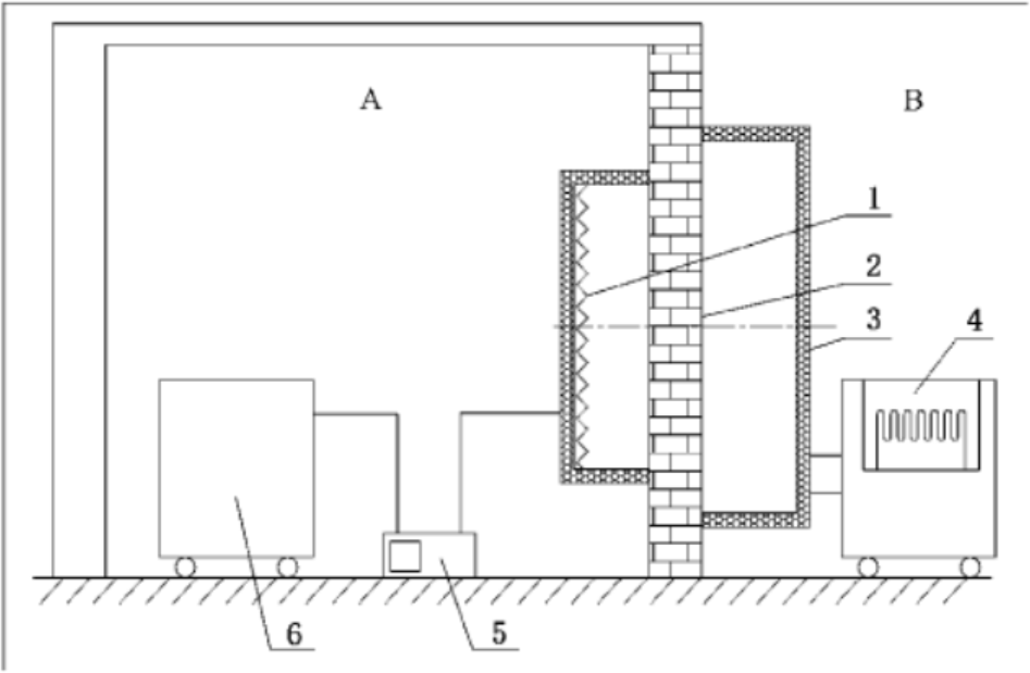 (1.計量熱箱;2.被測圍護結構;3.冷箱;4.制冷裝置;5.控制器;6.環境加熱器:A.室內;B.室外。)